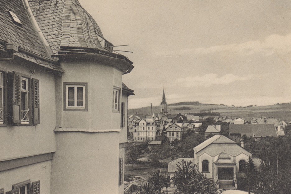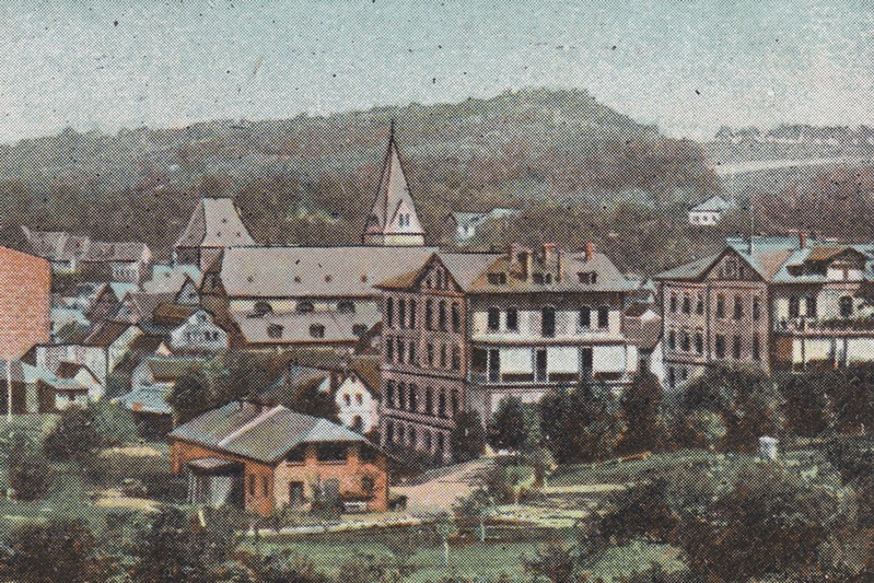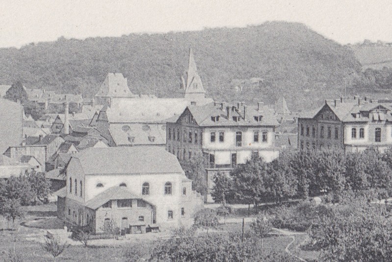 Blick vom "Frölenberg" auf die neu errichtete Turnhalle um 1910. Links das Gutshaus des Kalmenhofes.
