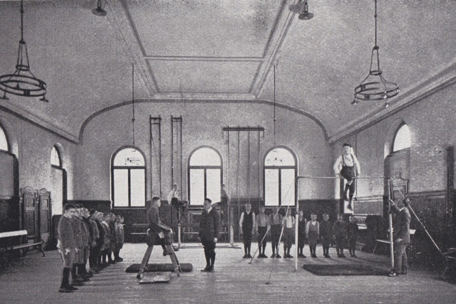 Sportunterricht in der Turnhalle Ende der 20er-